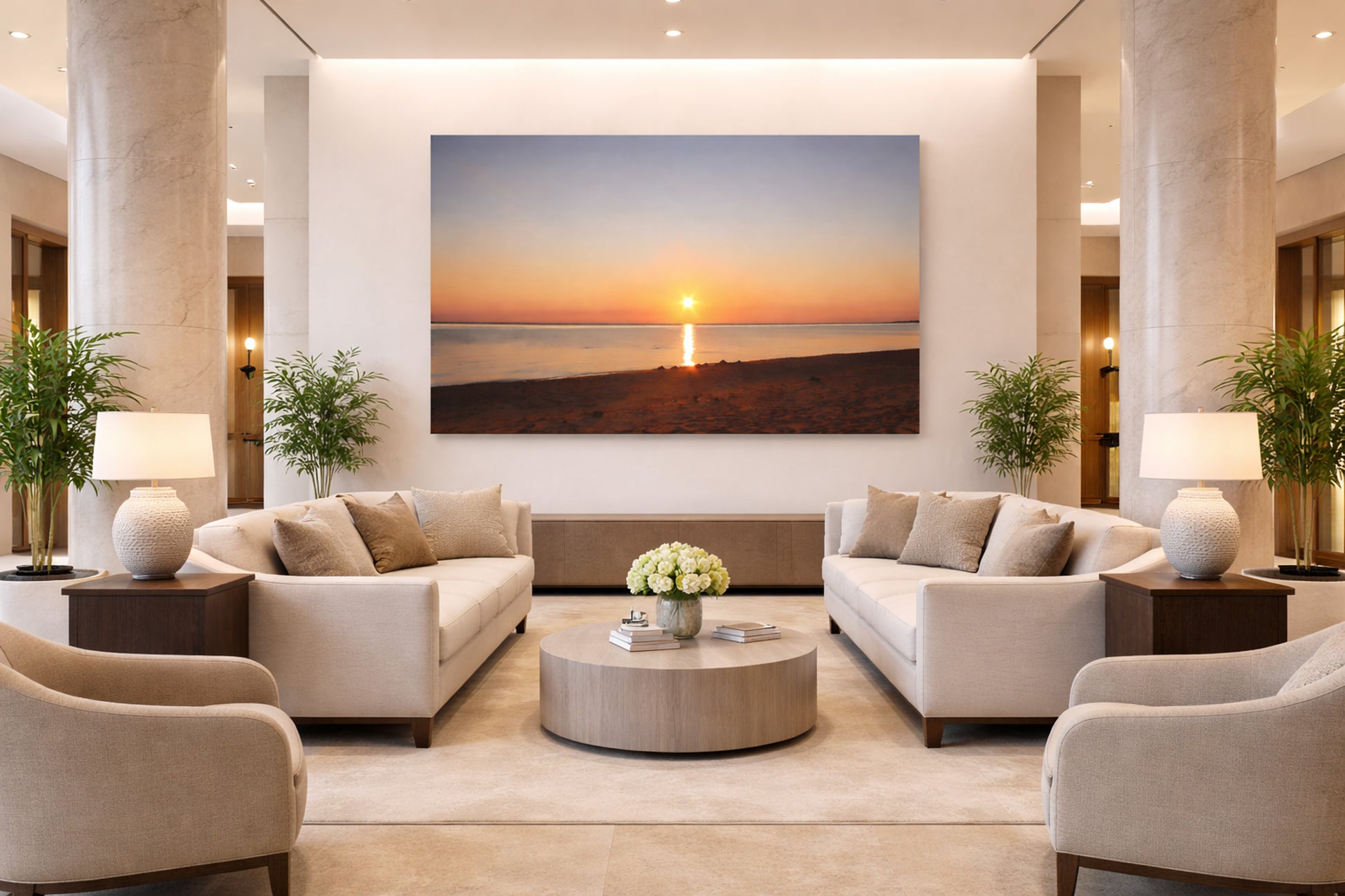 Soft warmth, open space, and subtle reflections create a calming presence designed for modern interiors.